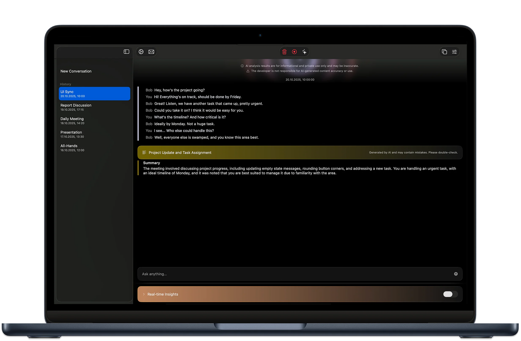 By default, it stores past meetings locally so you can reference them later. The app can generate summaries, insights, and suggested follow-ups. During a live meeting it also allows custom queries to the AI for additional context or analysis.